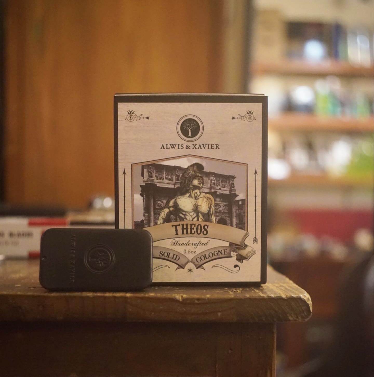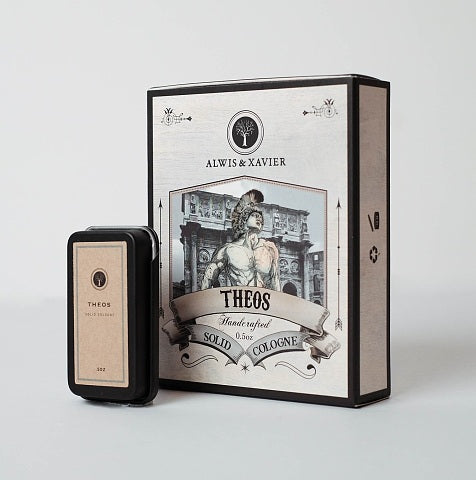 Ingredients of Theos Solid Cologne: Beeswax, Butyrospermum Parkii (Shea) Butter, Prunus Amygdalus Dulcis (Sweet Almond) Oil, Fragrance Oil, Maranta Arundinacea (Arrowroot Powder), Tocopherol (Vitamin E Oil), Macadamia Nut Oil, Essential Oils.