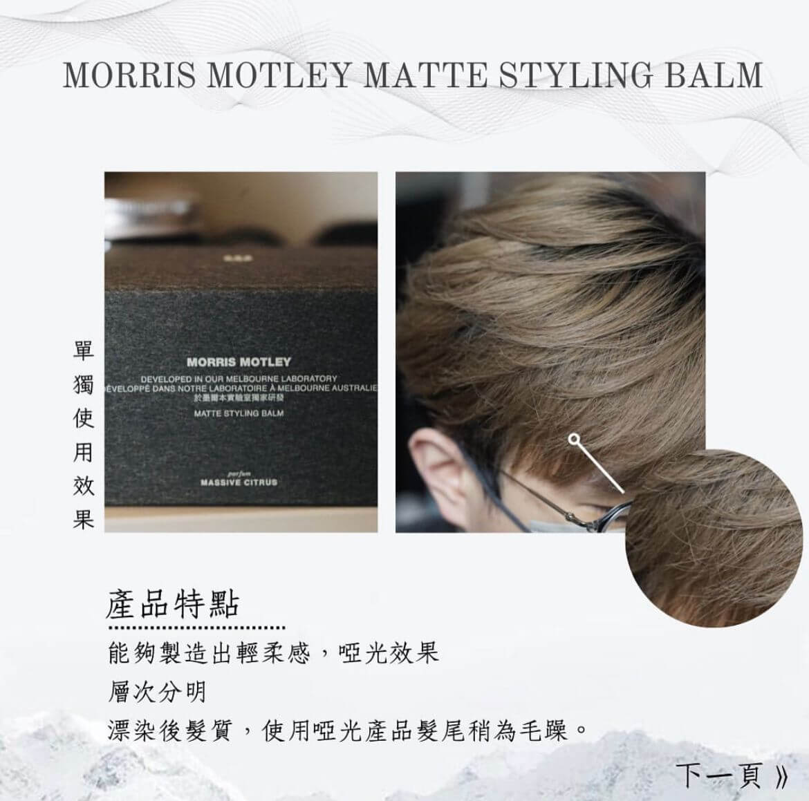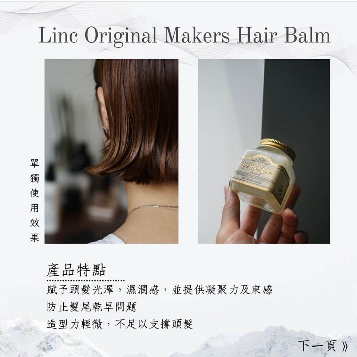 圖中效果用法:首先運用MM輕柔感同texture, 梳好個髮型,之後第二次上頭再用linc hair balm 加上MM 1:1比例,再塑造線條束感,令毛燥感完全消失。