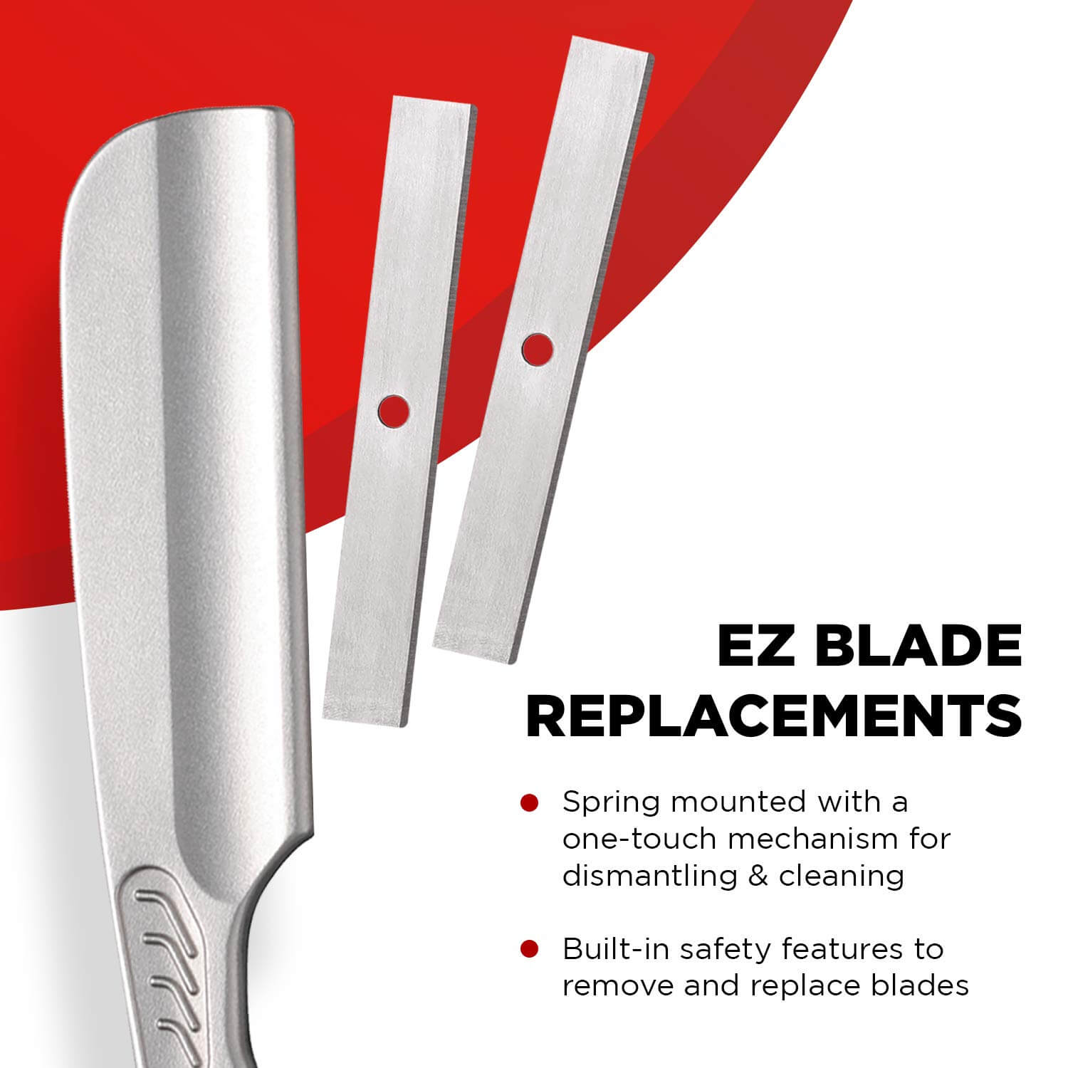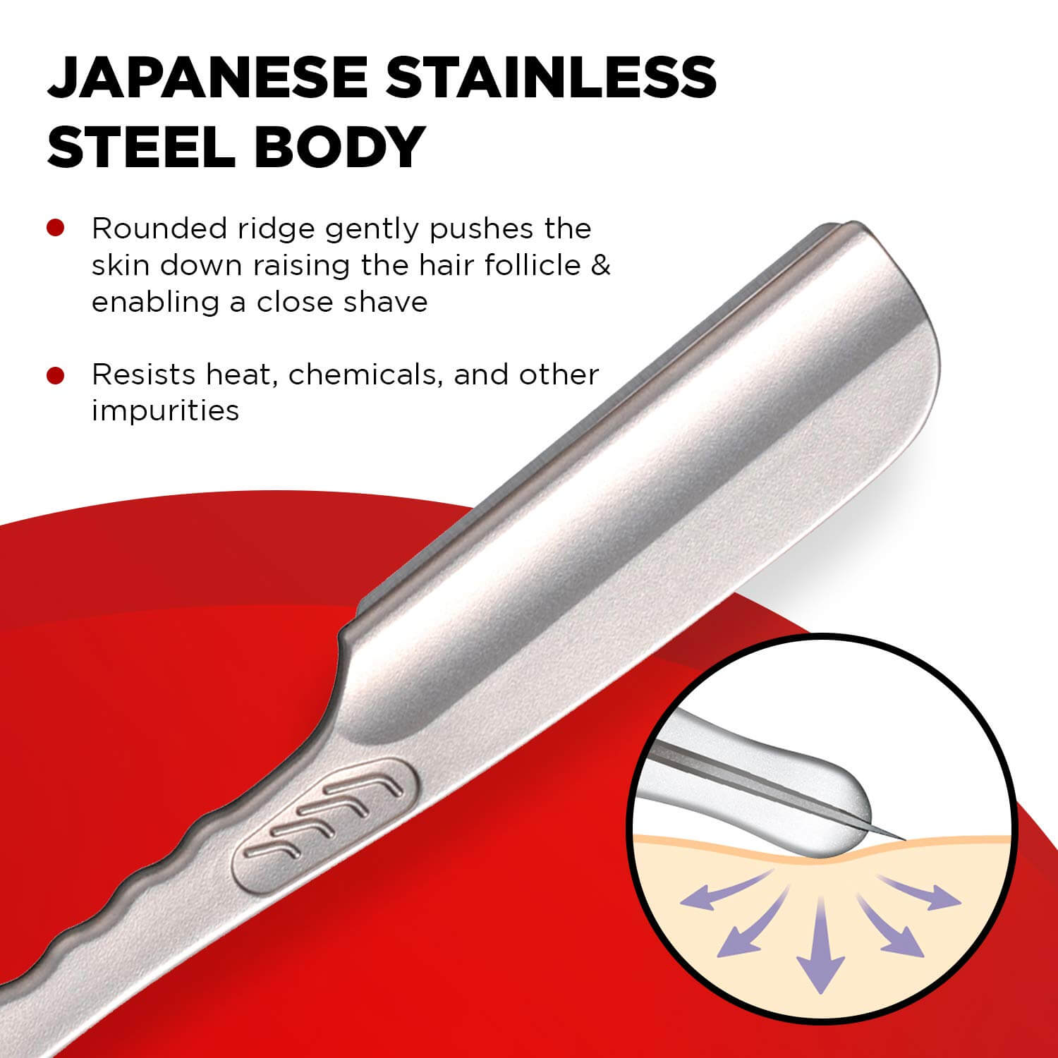DX系列: 重量最重與最具侵略性, 此把的設計是高侵略性的,刀頭沒有導圓的設計 改採用扁平設計 模擬剃刀(需要磨刀的那種) 的刀鋒面,配合刀頭的重量, 對於刮除粗硬鬍鬚是最佳工具 ,適合具有經驗豐富的理髮師使用