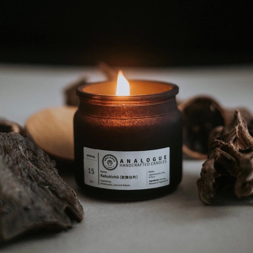 歌舞伎町的靈感來自多彩的夜燈和新宿的紅色大門。 聞起 來有日本松子的辛辣味,再加上新鮮的橘子和柚子。 蠟燭以蜂蠟和大豆蠟混合而成