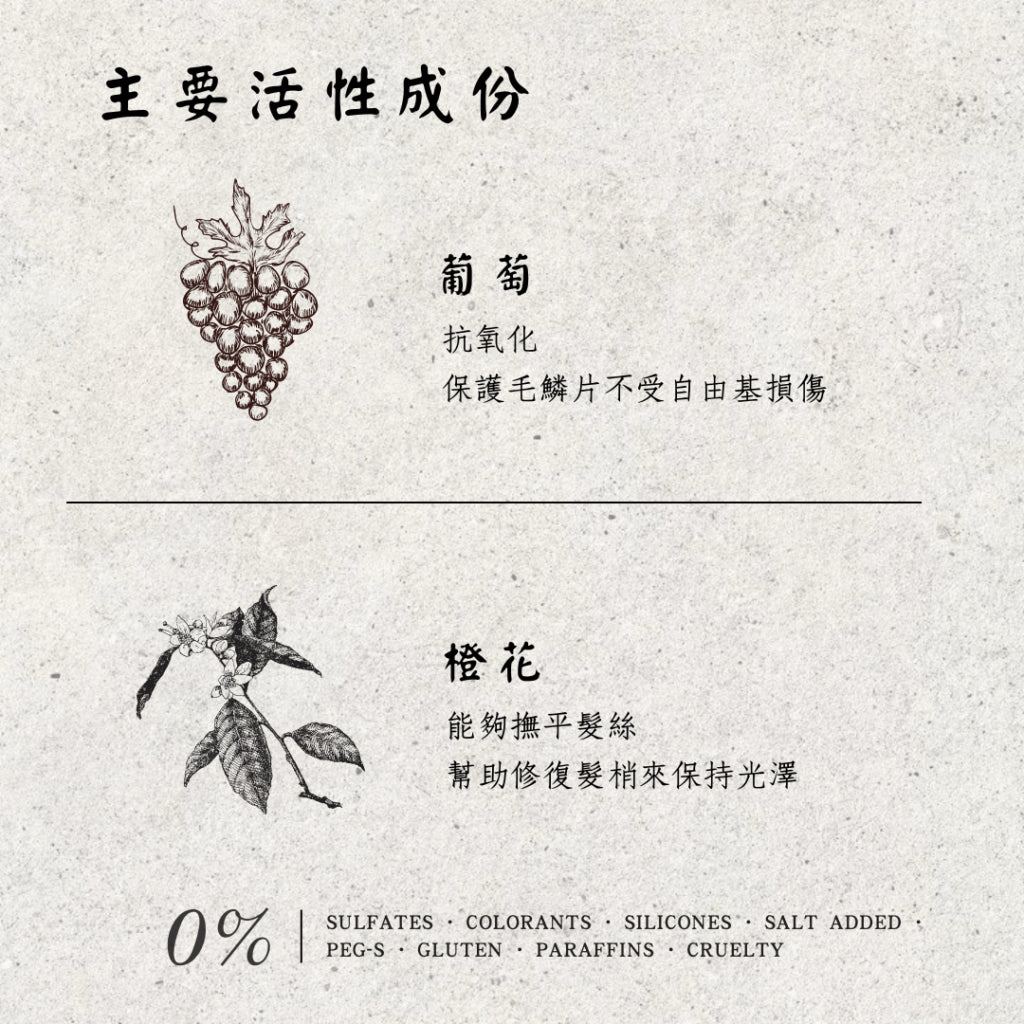 含有葡萄和橙花提取物,有助於恢復乾淨、健康的頭髮。